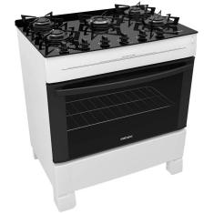 O forno de 86,5 litros conta com acabamento Limpa Fácil, visor amplo, vidro duplo na porta e uma grade deslizante. Com queimadores potentes — incluindo uma Mega Chama de 3,0kW —, é uma ótima escolha para quem precisa de desempenho e espaço na cozinha.